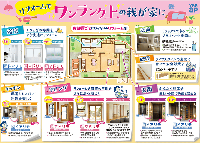 玄関、窓、キッチン、リビング、浴室、洗面、階段、各種の緊急対応